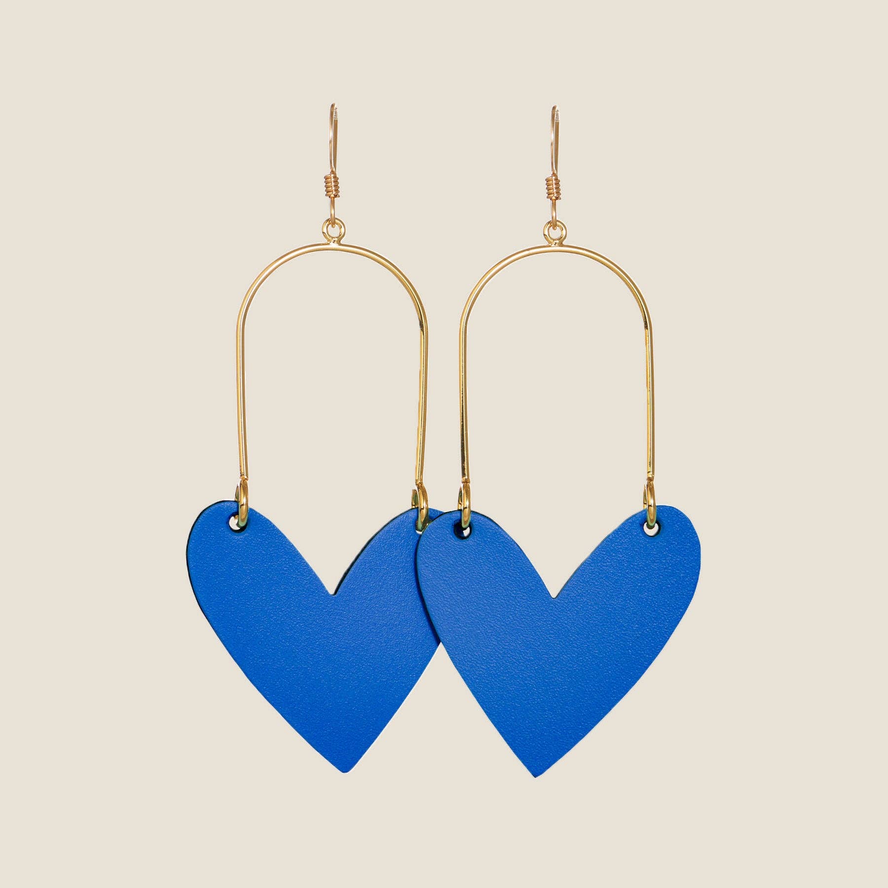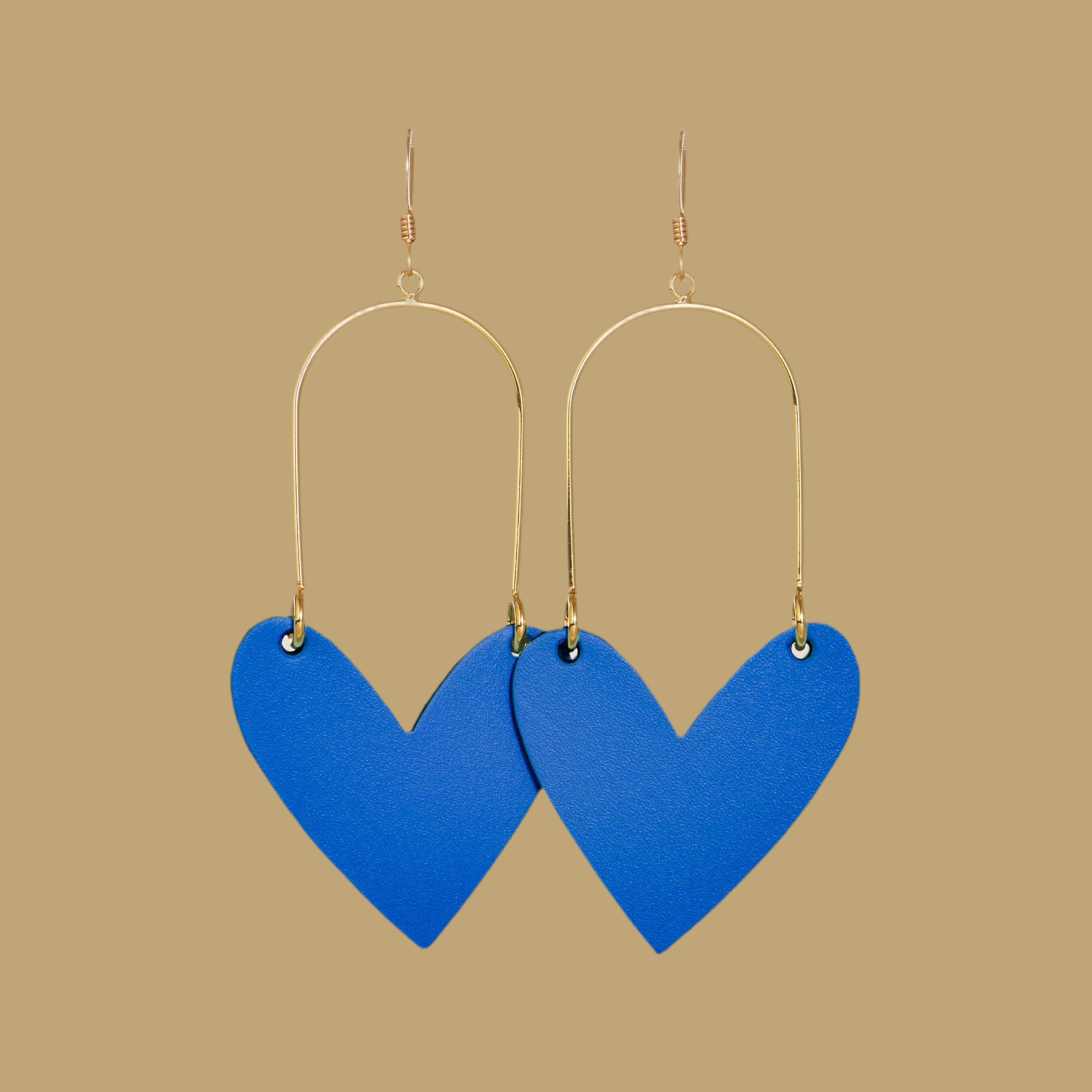 Our most-loved Sweetheart hoop earrings are now available in a blue lightweight leather. Whether you're wearing these earrings every day or just for game day, these sunny statement earrings are sure to be a favorite.