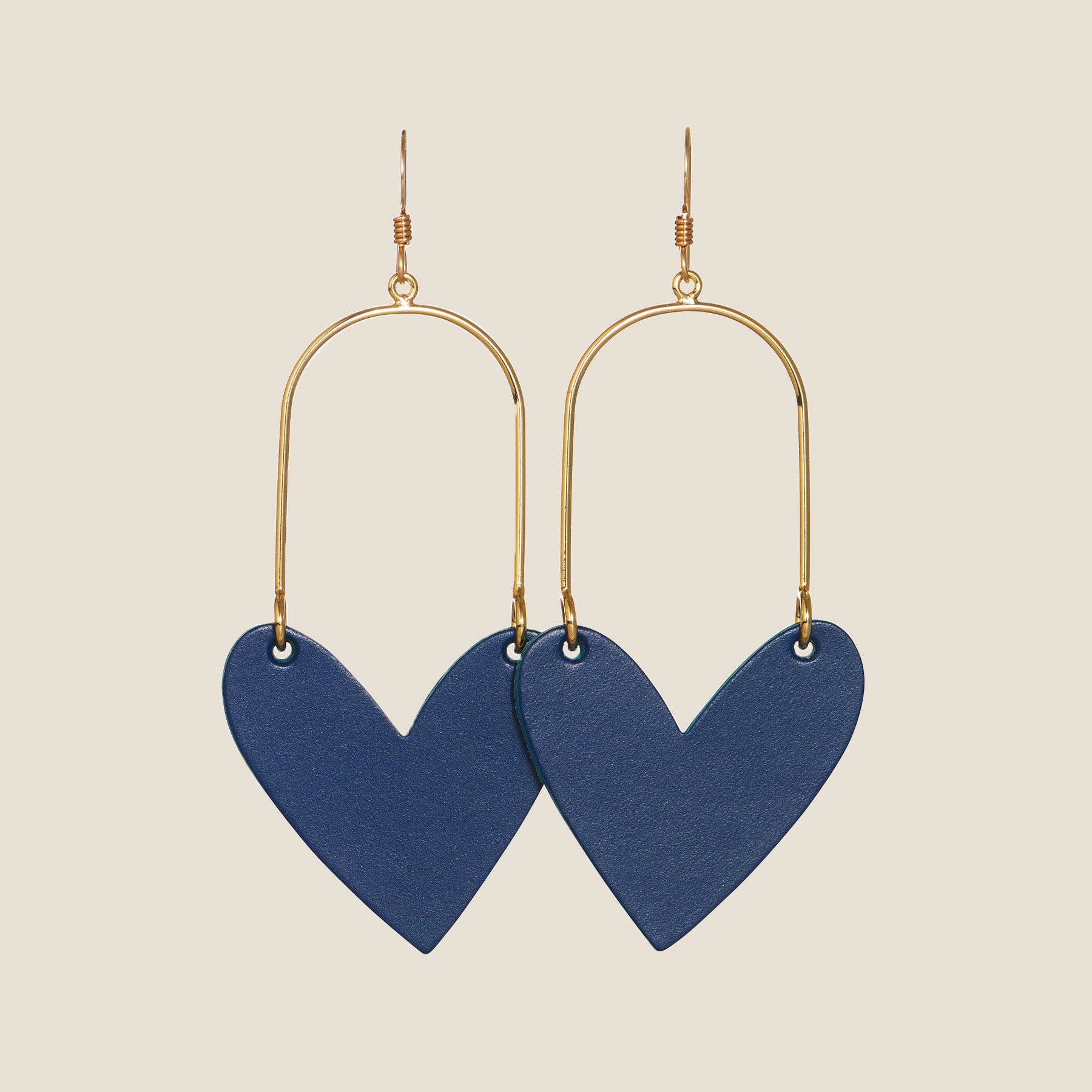 Our most-loved Sweetheart hoop earrings are now available in a navy lightweight leather. Whether you're wearing these earrings every day or just for game day, these sunny statement earrings are sure to be a favorite.